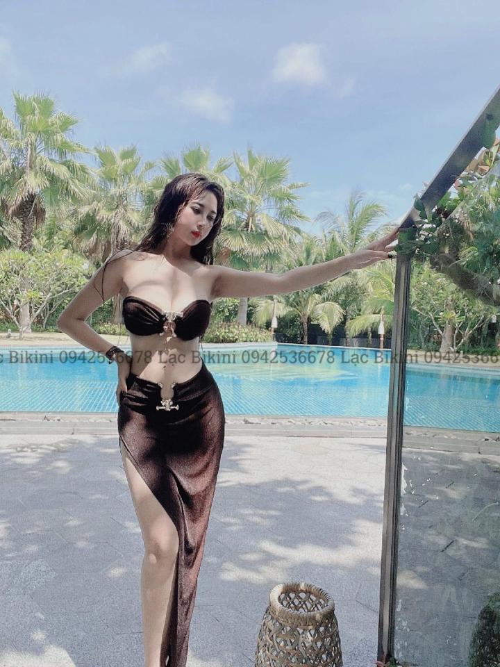 Set áo quây chân váy dài pool party Nâu sz M chất lượng
